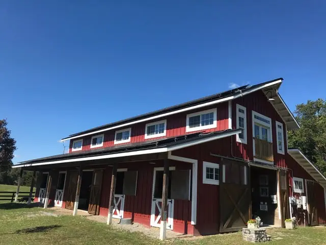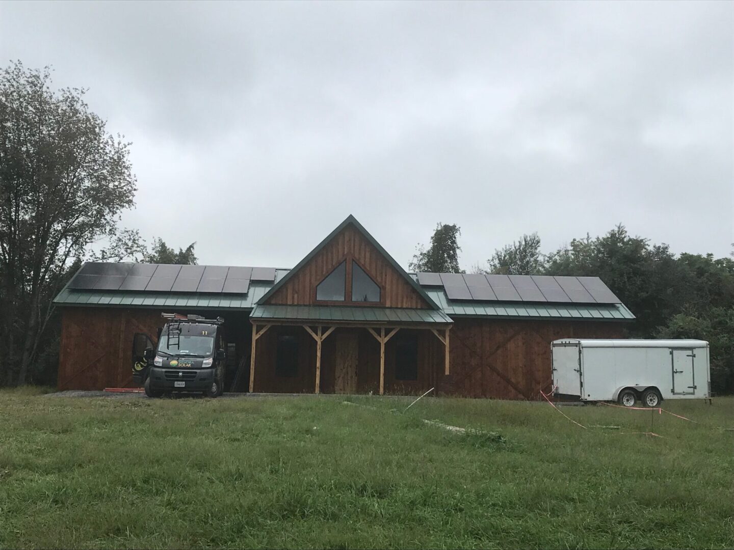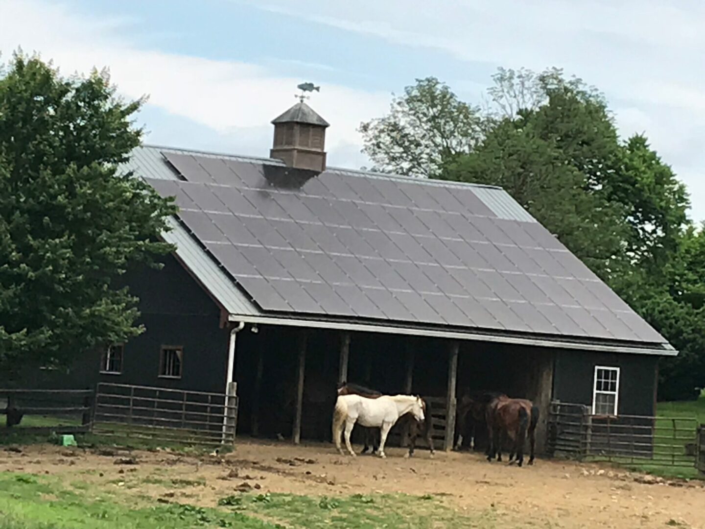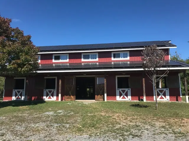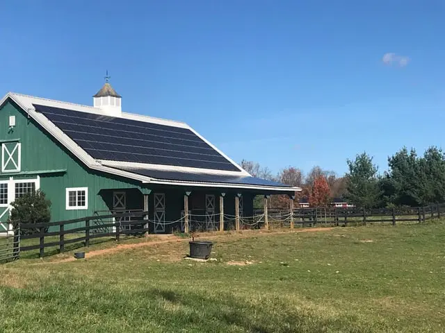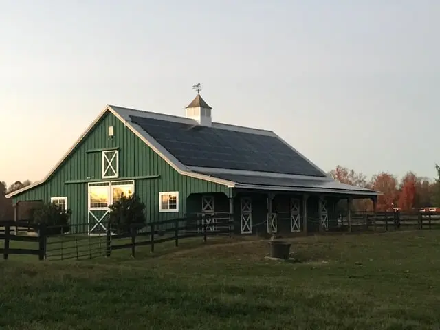 A green barn with white trim features a large array of solar panels installed on its roof.