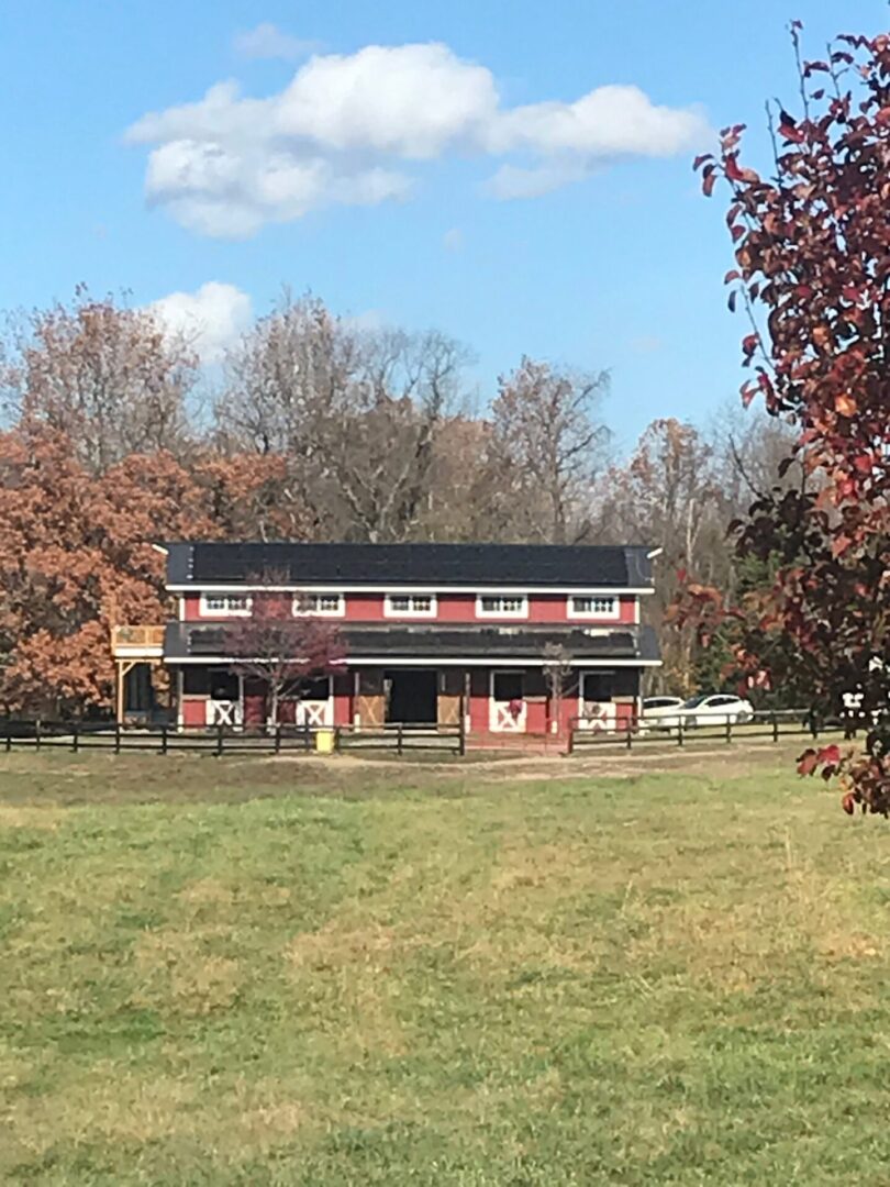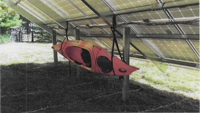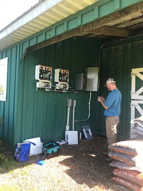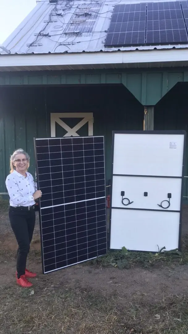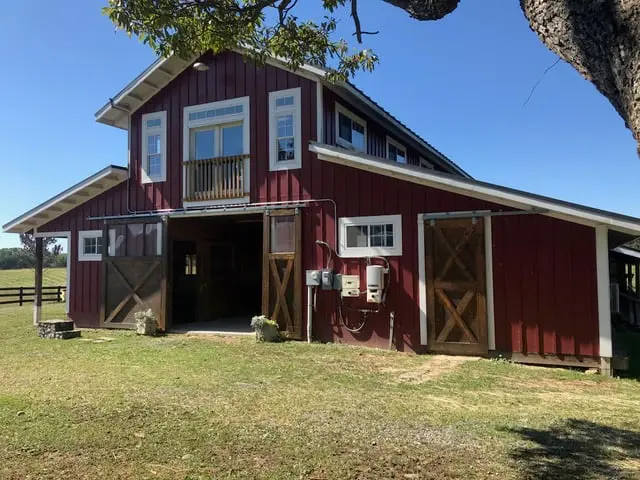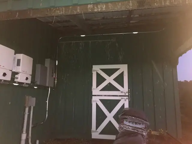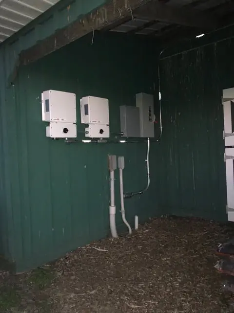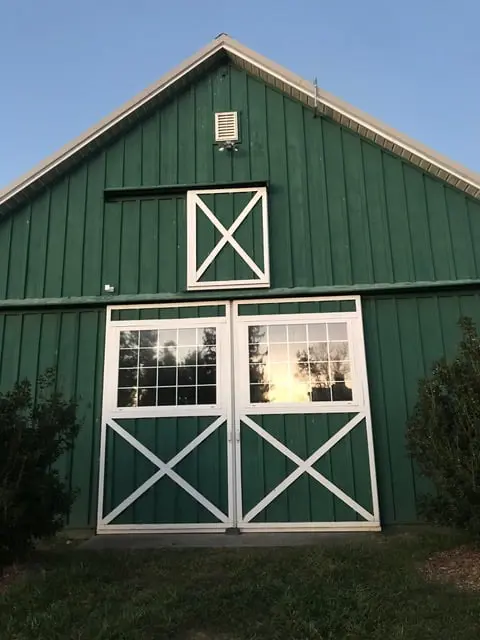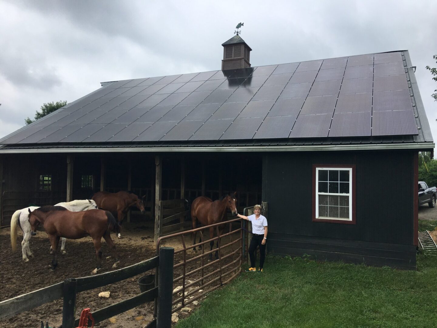A green barn with white trim features a large array of solar panels installed on its roof.