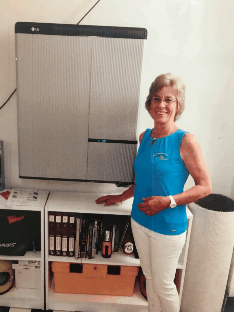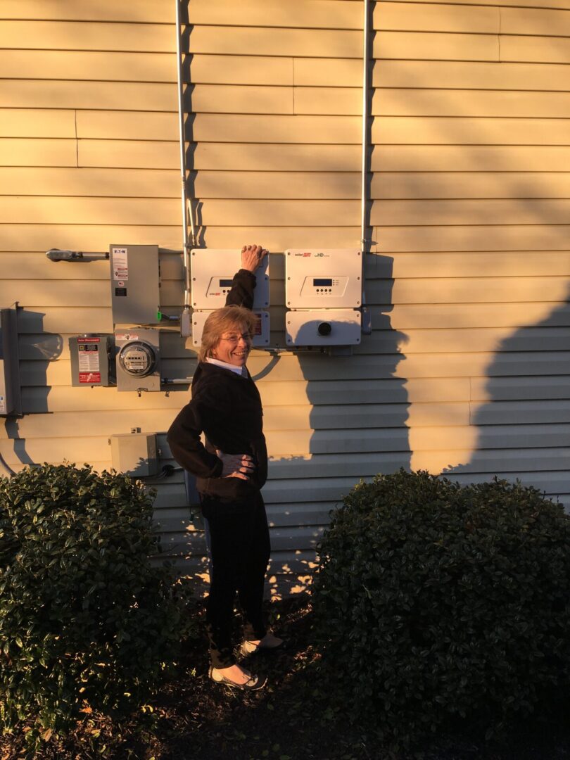 A person stands outdoors beside two wall-mounted solar inverters, smiling and posing with one arm raised, on a sunny day.